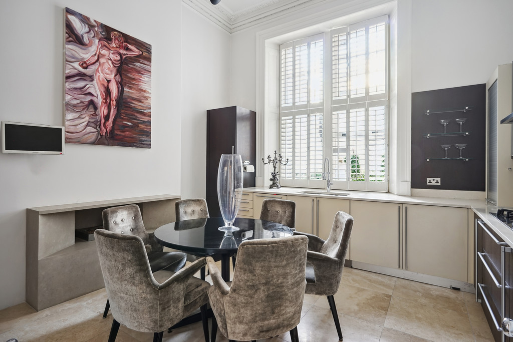 The contemporary, fully equipped eat-in kitchen is ideally positioned adjacent to the reception room, creating an effortless flow for entertaining and everyday living.