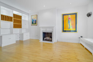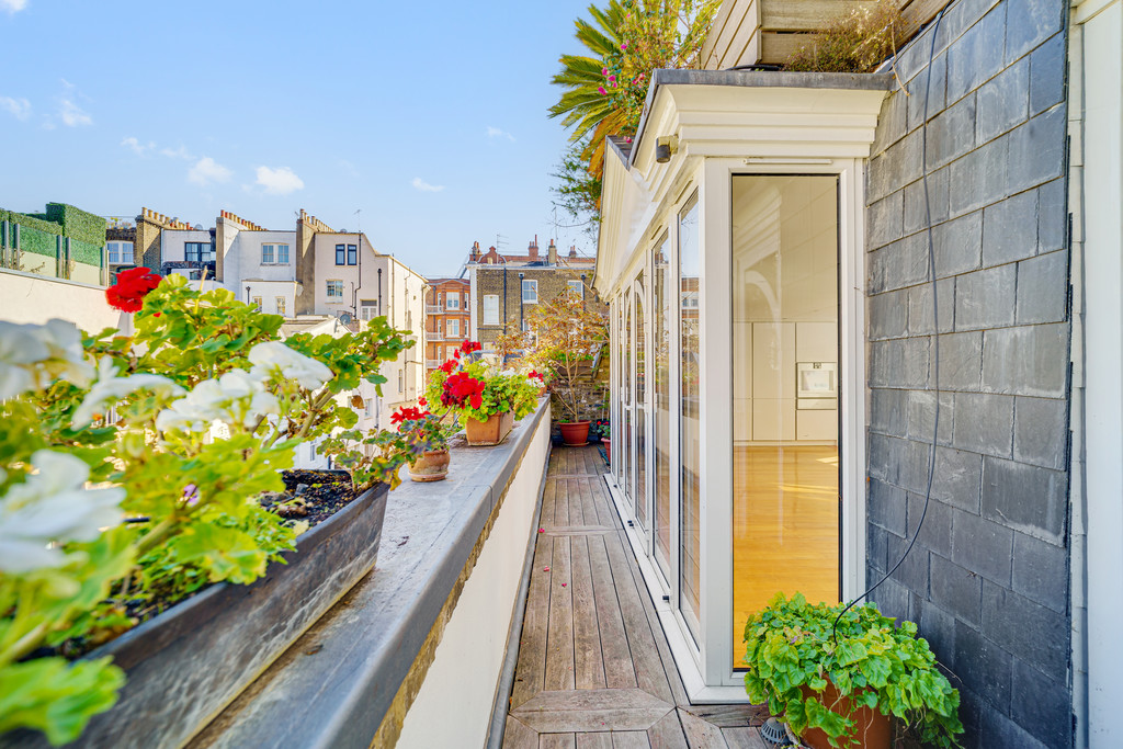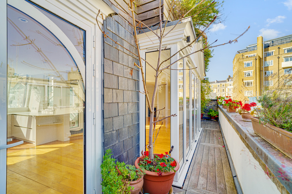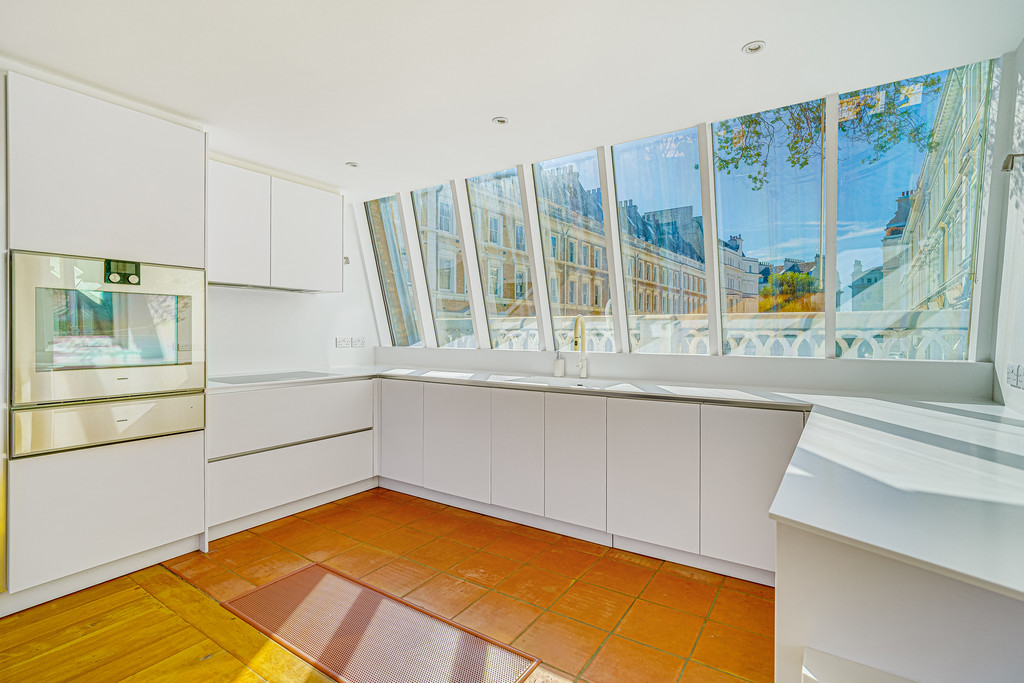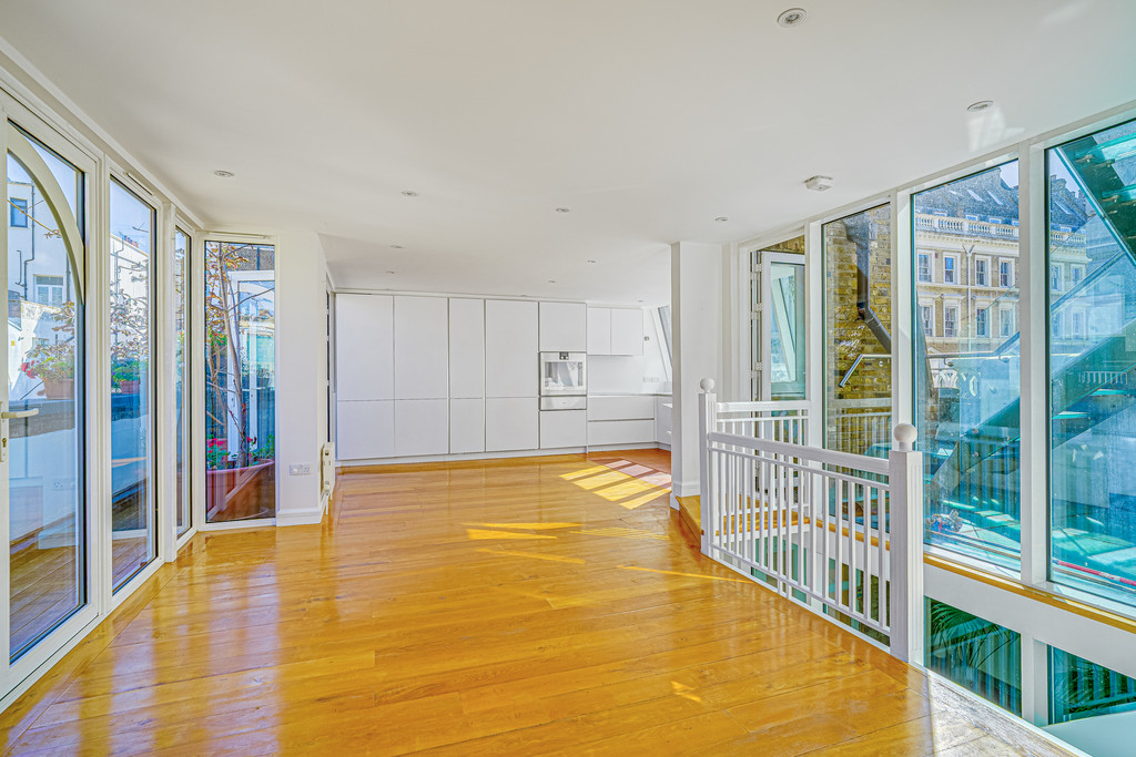 Arranged on the second floor the open plan kitchen complete with Gaggenau appliances and discreet wet bar was designed for entertaining, sitting to the left hand side and looking west from vast windows is filled with light. The diner reception room occupy the central and right hand side of this lateral space with additional balcony stretching the full width of the room looking over the pretty cobbles of the mews itself. From its central position there is a wide glass and steel staircase that leads onto a 750 square foot private roof terrace that covers the entirety of the roof.