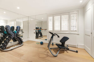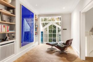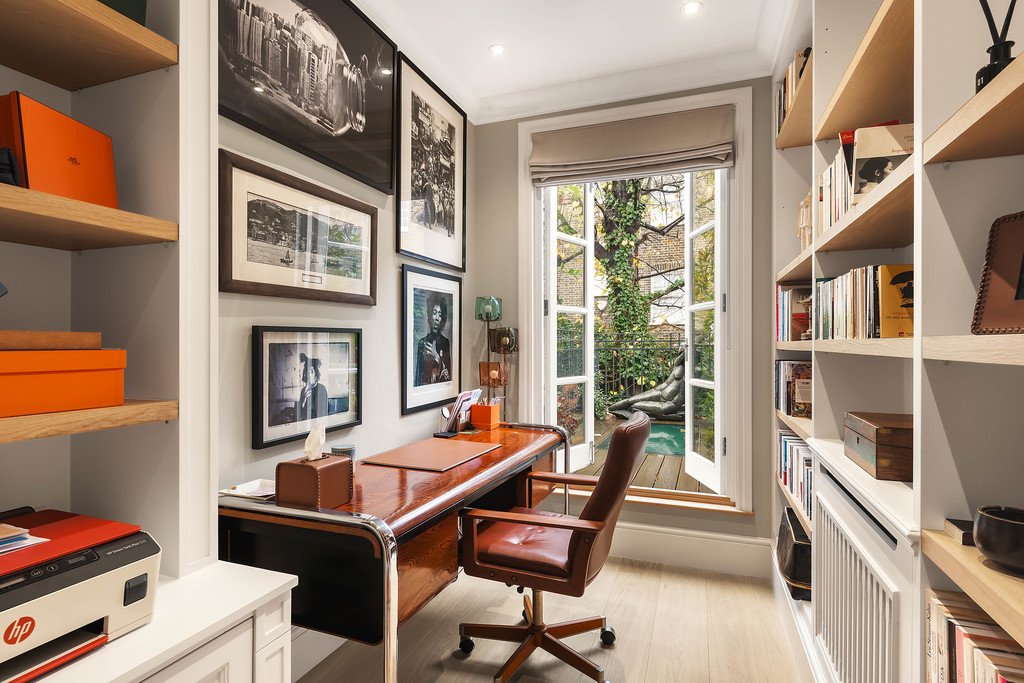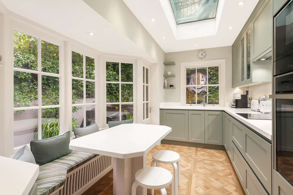 From the raised ground floor entrance with marble steps into Versailles parquet flooring throughout, the first sitting room has a simple slate hearth with white surround and is completed by a cosy gas effect fire creating an atmospheric focal point to the double room. To the rear the of the seating area an airy void opens on to the dining room and snug below with an abundance of natural light coming from the double height conservatory to the rear of these rooms. Heading down to the half landing the kitchen breakfast room with views over the luscious green garden from the built in banquet seating offer a perfect place for informal dining. A few steps away, the formal dining room with it voluminous ceilings and another gas fire create another wonderful entertaining space. Stone steps lead to the tranquil leafy garden with its mature trees and shrubs providing plenty of colour along with privacy. To the front of the house is another double bedroom with ensuite shower room and a utility cupboard, comfortably sized with built in storage the flexibility of the space allows this to be used as a home gym at present. Beyond this is an internal under pavement vault with plenty of fitted storage, plus another door opening to the external vault and an additional staircase leading back to the street. The principal bedroom with full en- suite bathroom with standalone bath, separate shower and twin vanity occupies the first floor, boasting bespoke cabinetry, a full width balcony and ceiling height measuring over 2.8m. A further two bedrooms and a bathroom sit on the floor above, with a bright study on the rear landing from which you access the roof terrace.